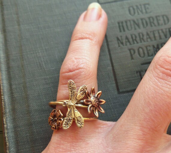 Tiny Flower Ring On Antiqued Brass Band Art Nouveau Tattoo Steampunk Stacking Ring