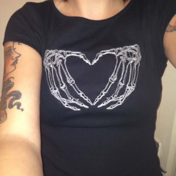 Creepy Cute Black Tee Tshirt Top With Skeleton Heart Design Embroidered Custom Made To Order Xs Xxl Halloween Creepy Girl
